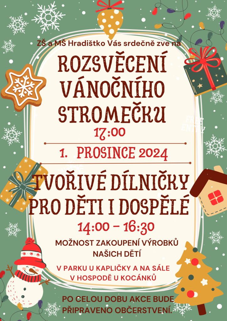 V 17:00 se rozsvítí stromeček a zazpívají naši žáci.